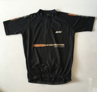 Maillot de ciclismo de la prueba Bike Meia Maratona Oeiras-Lisboa. Maillot discreto y perfectamente funcional. Talla L (4). Dispone de tres bolsillos en la espalda. Tejido transpirable Marca KX. En buen estado. Único defecto: desgaste impresión de la talla. Medidas: Anchura bajo las axilas: 49 cm. Longitud medida desde el hombro: 59 cm