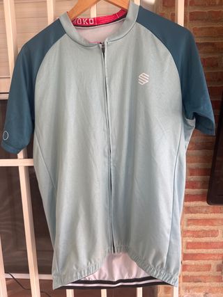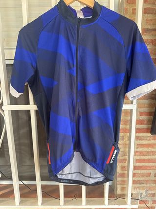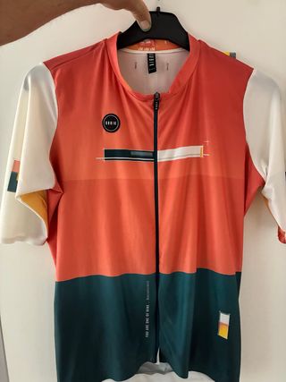 Maillot de ciclismo de verano. Manga corta y con acabados de buena calidad. Talla M. Con bolsillos traseros, cintura con acabados en látex para evitar que se suba. Mangas ajustadas y acabado en látex para evitar que se suban. Cierre con cremallera. Las fotos forman parte de la descripción.