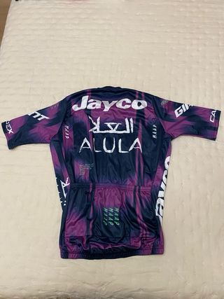 Maillot de ciclismo con diseño vibrante y moderno. - Marca: Jayco Alula - Colaboración: MAAP, Giant - Diseño: Estampado morado y azul - Detalles: Logos de patrocinadores visibles -Talla XL