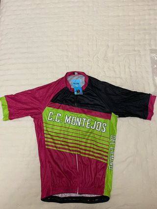 Maillot de ciclismo con un diseño llamativo en color fucsia, negro y verde lima. - Diseño frontal con C.C. MONTEJOS y líneas horizontales. - Detalle DEL CAMINO en la manga derecha. - Cremallera frontal completa. - Cuello con acabado en color burdeos. -2 unidades _Talla M