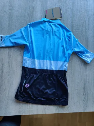 Maillot de ciclismo Shimano de manga larga en talla S. Con etiquetas originales. Medidas en la última foto - Diseño con bloques de color en negro y diferentes tonos de azul. - Cremallera frontal. - Tejido ligero y transpirable.