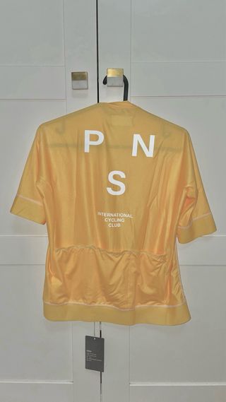 Maillot de ciclismo de manga corta en color amarillo. - Cuello redondo con cremallera. - Costuras blancas. - Logo de PNS CYCLING CLUB en blanco en el pecho. - Antideslizantes en brazos y cintura. - Transpirable en la espalda. Es Talla M asiática, lo que es una S europea.