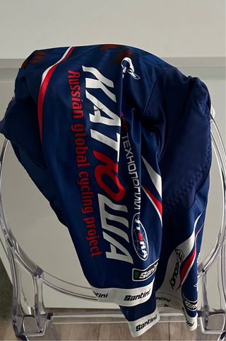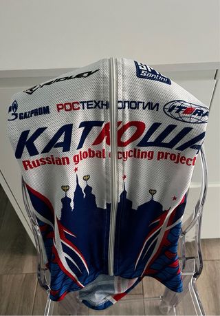 Conjunto de ropa de ciclismo que incluye culote, maillot y prenda térmica. - Diseño con KATUSHA y Russian global cycling project. - Logos de Santini y Ridley visibles. - Tejido azul con detalles en rojo y blanco.