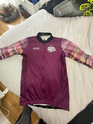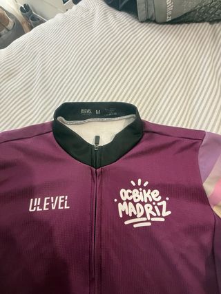 Maillot y pantalón de ciclismo Elevel para invierno con un diseño moderno y llamativo. usando 3 veces talla M - Mangas con estampado a rayas en tonos morados, rosas y ocres. - Cuello alto negro. - Cremallera frontal completa. - Logo de Ulevel en el pecho izquierdo. - Logo ocbike MADRIZ en el pecho derecho. - Banda elástica en la cintura con el logo Ulevel repetido.