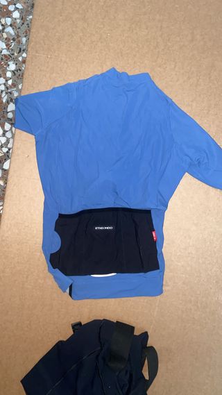 Conjunto de ciclismo Etxeondo. - Chaqueta azul. - Maillot negro con logo Etxeondo.