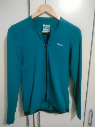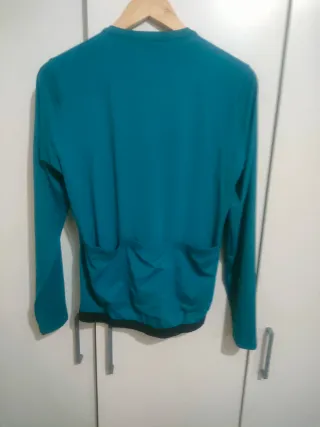 Maillot de ciclismo de manga larga en color azul verdoso. Pone talla l , pero parece más talla s , se entrega en mano, Badalona - Tres bolsillos traseros. - Banda elástica en la cintura. - Cremallera frontal.