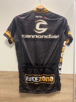 Maillot de ciclismo con diseño en negro y detalles dorados. - Marca: Cannondale - Diseño: Bike Zona - Logos: Tactic, Racing Shox, Geax, Alpina, NW, Oneal, PowerBar, Prologó - Mangas cortas - Cuello con cremallera parcial