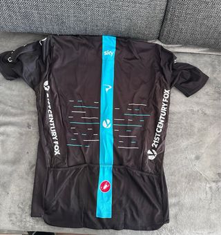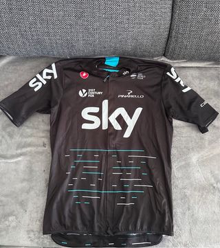 Maillot de ciclismo del equipo Sky. - Color negro con detalles en azul y blanco. - Logo de Sky en grande en el frontal. - Logo de Pinarello. - Logo de UCI World Tour.