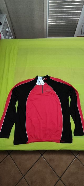 Maillot nuevo de ciclismo de muy buena calidad. Lo tengo que vender porque no me está bien. Lo he usado una sola vez. Está hecho en un material super transpirable, es muy cómodo. El tallaje es una M, pero si eres de complexión ancha, te estará justo. Incluye bolsillos traseros, uno de ellos con cremallera. Las dimensiones son: 42 cm de anchura de pecho, 62 cm de largura en la zona de la espalda, 44 cm de largura de cremallera por la parte delantera y 38 cm de anchura de cintura.
