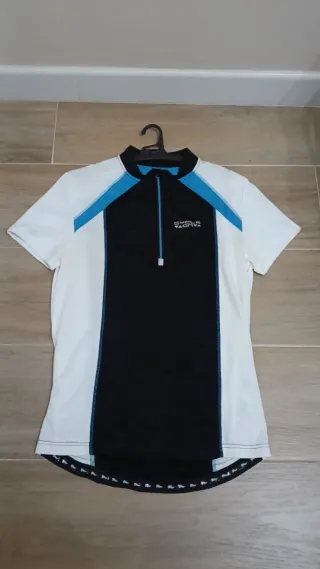 Maillot de ciclismo para mujer en talla S. Diseño moderno y cómodo. - Tejido técnico transpirable. - Cremallera frontal completa. - Mangas cortas con detalle de malla. - Logo de la marca en el pecho. - Inscripción KEEP CYCLING en la manga. - Con goma elástica de máxima calidad en mangas y perneras - Badana de máxima calidad