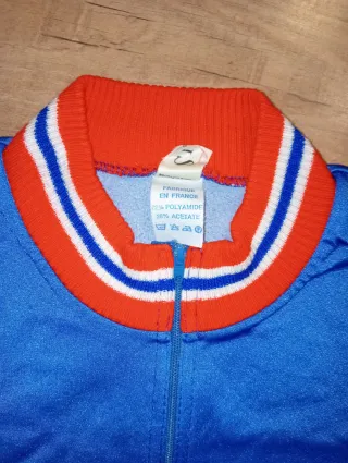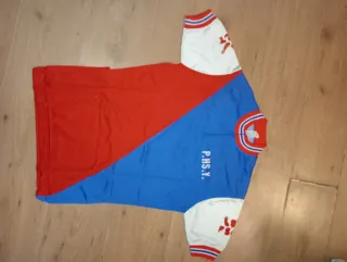 Maillot ciclismo vintage con diseño bicolor en rojo y azul, y mangas blancas. - Talla L/XL. - Inscripción P.H.S.Y. en el frontal. - Detalles de logo en las mangas.