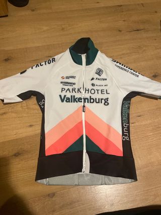 Conjunto de maillot y culote de ciclismo Bioracer con diseño Parkhotel Valkenburg. - Maillot de manga corta con cremallera frontal. - Culote negro con tirantes. - Detalles de rayas en color rosa, coral y verde. - Logos de Factor, Shimano y Black Inc.