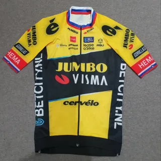 Maillot de ciclismo del equipo Jumbo Visma, talla M. Diseño inspirado en el corredor Primož Roglič. - Tejido amarillo y negro. - Logos de patrocinadores visibles: Jumbo, Visma, Cervélo, Hema, Gorillas, Bet City, AGU, Lease a Bike, SRAM, Skoda. - Cuello con detalles en rojo, blanco y azul.
