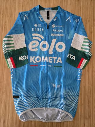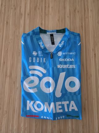 Maillot de ciclismo de la marca Gobik del equipo Eolo Kometa. Talla S. Usado en muy pocas ocasiones, en perfecto estado. Corte ajustado, para temporada de verano, tres bolsillos traseros y cinta de ajuste inferior. Con tejido técnico transpirable de rejilla, versión de calidad superior dentro de la gama de maillots Gobik.