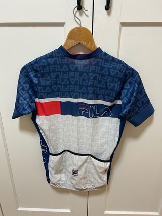 Maillot de ciclismo de la marca Fila en talla L. Presenta un diseño deportivo con el logo de la marca. - Diseño con logo Fila. - Manga corta. - Cremallera frontal.