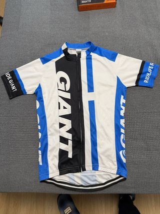 Conjunto ciclismo compuesto por un maillot y una culotte. El maillot es de manga corta, con diseño llamativo en azul y negro, y varias marcas de patrocinadores. La culotte es negra. Ambos están en buen estado. - Incluye maillot Giant y culotte. - Diseño deportivo y colorido. - Perfecto para ciclismo de carretera.