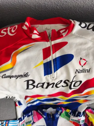 Lote de varios maillots de ciclismo de las tallas L y XL. Incluye maillots de equipos como Banesto, Crédit Agricole, Mapei y Giant. Se vende el lote completo a ese precio - Maillot Banesto con diseño de rayas. - Maillot Crédit Agricole verde con logo. - Maillot de puntos rojos. - Maillot Mapei con diseño colorido. - Maillot Mapei azul con diseño geométrico. - Maillot Giant Alpecin negro y blanco.