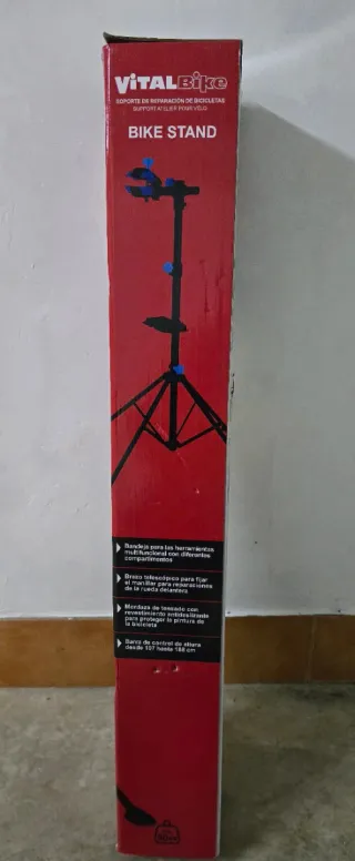 Soporte de reparación para bicicletas de la marca VitalBike. Nuevo, sin usar. Ideal para mantener tu bici en perfecto estado. - Bandeja multifuncional para herramientas con compartimentos. - Brazo telescópico para fijar el manillar. - Mordaza de tensado con revestimiento antideslizante. - Barra de control de altura ajustable (107-188 cm). - Soporta hasta 30 kg. - Cuando no lo uses, se pliega para ahorrar espacio. Palabras clave: Ciclismo, Tour de France, Vuelta a España, Gira de Italia, bicicleta de carretera. MTB Specialized, Trek, Cannondale, Giant, Shimano, SRAM, Campagnolo, Rapha, Castelli, Gobik, maillot, culotte, carbono