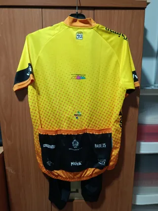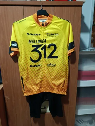 Maillot de ciclismo de manga corta solo usado una vez - Color amarillo con detalles en naranja y puntos. - Logo de Giant y Taiwan. - Tejido técnico. - bolsillo lateral con cremallera - tres bolsillos traseros Camisa talla L y maillot talla 5 *Algo negociable*