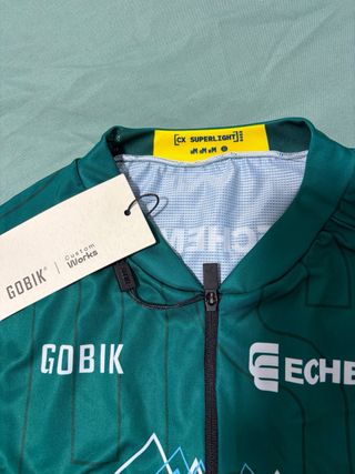 Maillot de ciclismo Gobik CX Superlight en talla L. Diseño deportivo y transpirable. El maillot esta completamente nuevo, sin uso. - Color verde azulado con detalles en blanco y amarillo. - Cremallera frontal completa. - Tejido ligero y cómodo.