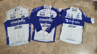 Conjunto de ropa de ciclismo formado por un maillot, un chaleco cortavientos y una chaqueta de entretiempo. Marca Noret (fabricada en Francia). Talla XS. Chaqueta Ideal para primavera - otoño. Tejido afelpado. Maillot tipo Aero de licra. Corte láser en las mangas y en la cintura. Chaleco cortavientos con bolsillos en la espalda. Equivale a una S. Buen estado, marcas en la espalda de las tres prendas por llevar dorsales. Gobik, Spiuk, Gore, Bioracer, Castelli, Mavic, Specialized, Nalini, Endura, Giordana, Etxe Ondo