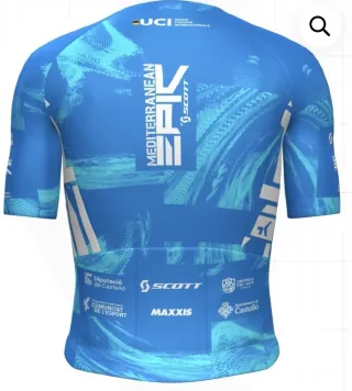 Maillot de ciclismo de la marca Gobik, modelo Mediterranean Epic. - Talla M. - Diseño en tonos azules con motivos acuáticos. - Logo de UCI en la nuca. - Logos de Scott, Maxxis y otros patrocinadores. - Tres bolsillos traseros.