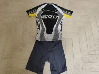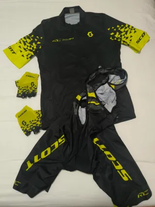 Conjunto de ciclismo de la marca Scott. - Maillot de manga corta. - Culotte. - Guantes. - Diseño en negro y amarillo.