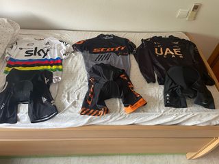 Conjunto de ropa de ciclismo profesional. - Maillot Sky con diseño arcoíris. - Maillot Scott gris y negro. - Maillot UAE Team negro. - Culotte negro con detalles naranjas. - Culotte negro con detalles blancos.