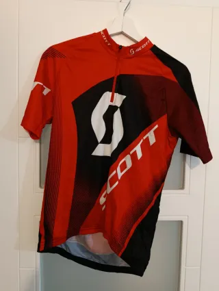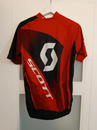 Maillot de ciclismo Scott con un diseño moderno en rojo y negro. Talla: M - Mangas cortas. - Cremallera frontal. - Logo de Scott en el pecho y en la manga.