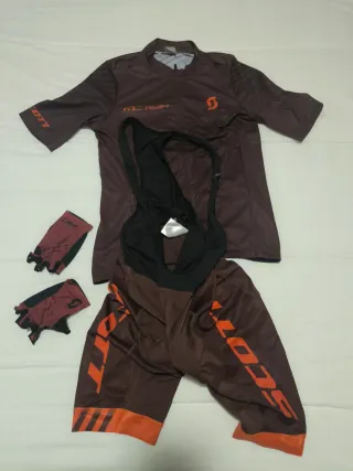 Conjunto de ciclismo Scott que incluye maillot, culotte y guantes. - Maillot de manga corta en color marrón con detalles naranjas. - Culotte marrón con tirantes negros y detalles naranjas. - Guantes de dedo corto en color marrón y naranja.