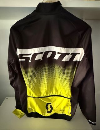 Chubasquero de ciclismo Scott RC con un diseño moderno en negro y amarillo. - Logo de Scott en amarillo. - Cremallera frontal. - Abertura trasera para acceder a los bolsillos del maillot. - Bolsillo trasero con cremallera. Nuevo, sin uso.