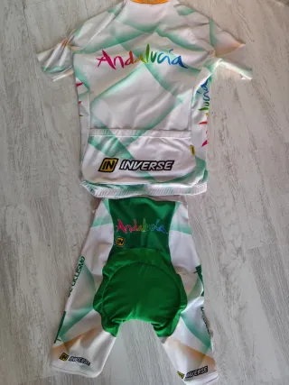 Conjunto de maillot y culote de ciclismo con diseño de Andalucía. - Maillot de manga corta. - Culote con tirantes. - Estampado multicolor con detalles geométricos. - Logo de Inverse en ambas prendas.