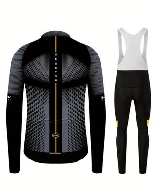 Conjunto de ciclismo de invierno con diseño moderno. - Maillot de manga larga con cremallera. - Culotte con tirantes. - Detalles en color amarillo. - Estampado NW.