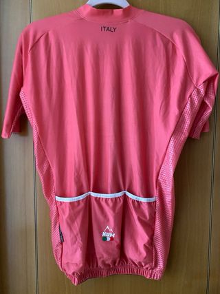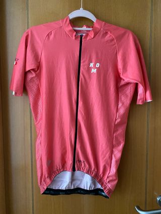 Maillot de ciclismo para hombre con un diseño moderno y llamativo. - Color coral vibrante. - Paneles laterales de malla para mayor transpirabilidad. - Cremallera frontal completa. - Logo KOM en blanco en el pecho. - Detalle ITALY en la parte inferior. - Made in Colombia
