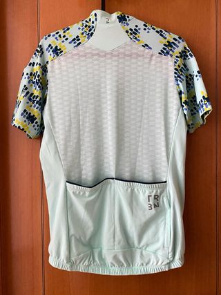 Maillot de ciclismo de manga corta, con un diseño estampado muy chulo. Está en perfecto estado. - Talla:XL - Color: Verde menta y azul turquesa - Cierre de cremallera
