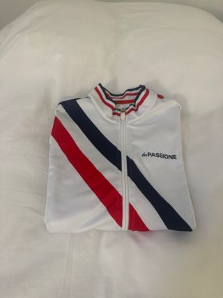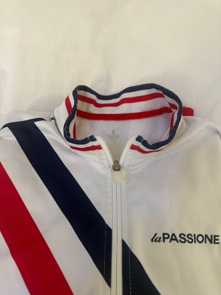 Maillot de invierno de la marca La Passione con un diseño deportivo y elegante. Talla S - Diseño de rayas rojas, blancas y azul marino. - Cuello alto con detalles a rayas. - Cremallera frontal.