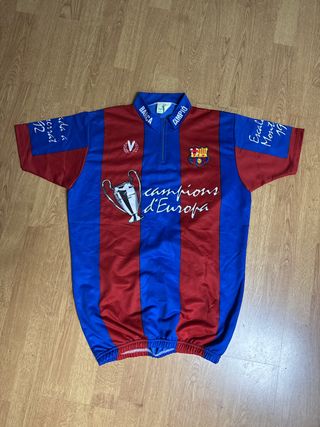 Maillot de ciclismo conmemorativo del FC Barcelona. - Diseño a rayas rojas y azules. - Inscripción Champions d'Europa y Barça Campió. - Escudo del FC Barcelona. - Detalle de la copa de Europa.