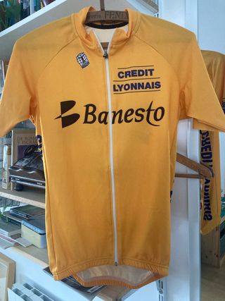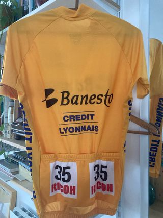 Maillot de ciclismo Bioracer del equipo Banesto, usado por Miguel Indurain en 1991. Diseño icónico. - Color naranja (se ve bien en la imagen 4). - Logo de Banesto y Credit Lyonnais. - Parche de Bioracer.