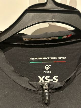 Maillot de ciclismo Pissei en talla S. Diseño moderno y funcional. - Color negro. - Cremallera frontal completa. - Logo de Pissei en el pecho.