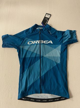Maillot de ciclismo de la marca Orbea en color azul con un diseño geométrico. - Cremallera frontal completa. - Tejido transpirable. - Banda elástica en el bajo. Nuevo a estrenar talla S