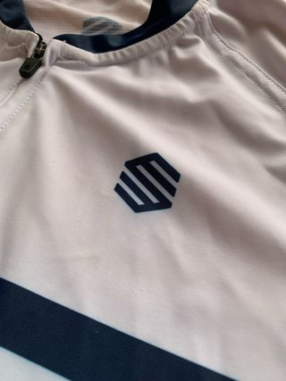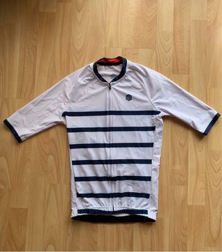 Maillot de ciclismo Siroko en talla XS. Diseño a rayas. - Color principal blanco con rayas horizontales en azul marino. - Cremallera frontal completa. - Manga corta. - Tres bolsillos traseros. - Bajo con banda elástica. NO LEER Castelli Gobik GSport MAAP PAS Pas Normal Studios Etxeondo Ale Santini Pissei Assos Bioracer Endura Giro Hiru Poc Scott Shimano Spiuk