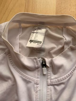 Maillot de ciclismo de manga corta de la marca Van Rysel, con un solo uso, en talla S - Color blanco con la parte delantera con rayas horizontales grises y azul marino. - Cremallera frontal completa. - Cuello redondo. - Usado una sola vez, está nuevo. - Bandas reflectantes traseras y en mangas. - 3 bolsillos traseros+ 2 bolsillos con cremallera.