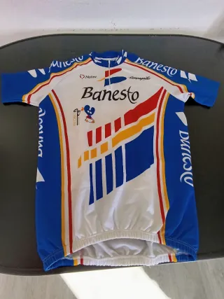 Maillot de ciclismo del equipo Banesto. Diseño icónico con los colores del equipo. - Marca: Nalini - Patrocinadores: Banesto, Campagnolo - Diseño: Blanco, azul, rojo y amarillo