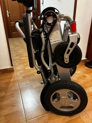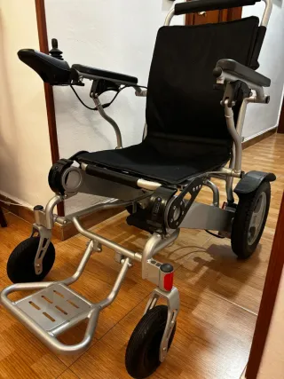 Silla de ruedas eléctrica, diseñada para ser ultraligera y plegable, facilitando su transporte y almacenamiento. - Estructura metálica plateada. - Asiento y respaldo en tela negra. - Reposabrazos acolchados. - Joystick de control. - Ruedas traseras grandes y delanteras pequeñas. -Precio original 1000€