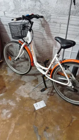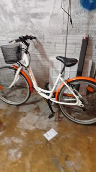 Bicicleta de paseo con cesta delantera y guardabarros. - Color blanco con detalles naranjas. - Cesta de malla negra. - Guardabarros delantero y trasero naranjas. - Pata de cabra.
