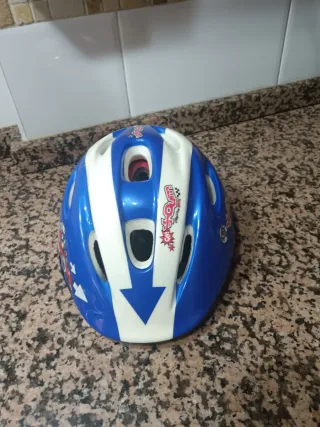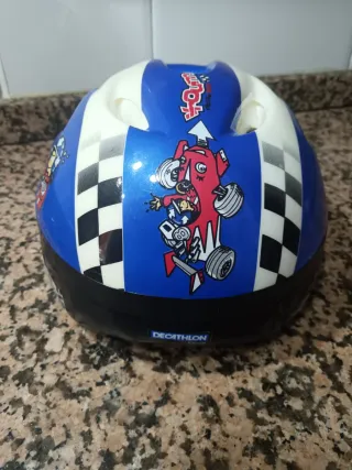 Casco de bicicleta para niños con un diseño divertido y colorido. - Diseño con temática de carreras. - Color azul y blanco. - Detalle de cuadros de ajedrez. - Logo de Decathlon en la parte frontal.