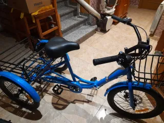 Triciclo para adulto, ideal para paseos y transporte. Su diseño plegable facilita el almacenamiento. - Color azul. - 7 velocidades. - Cestas delantera y trasera.