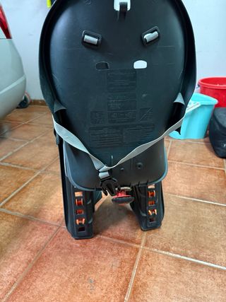 Silla para bicicleta de bebé, ideal para transportar a los más pequeños de forma segura. - Diseño ergonómico. - Asiento acolchado en color naranja. - Cinturones de seguridad. - Reposapiés ajustables.