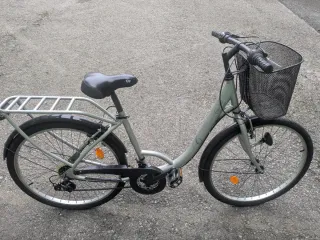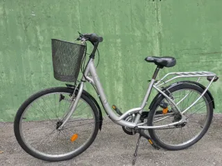 Bicicleta de paseo en color plateado, ideal para desplazamientos urbanos. Tiene un pedal mal, que tendría que cambiar el comprador. Cuenta con: - Cesta delantera. - Portaequipajes trasero. - Guardabarros. - Pata de cabra. Recogida en Treto (Cantabria) Podría llevarla a los alrededores de Santander por 15€ más.