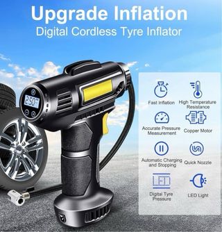 Este compresor de aire digital portátil es compacto y fácil de usar. - Pantalla digital para fácil lectura. - Diseño ergonómico para un agarre cómodo. - Incluye adaptadores para diferentes usos.